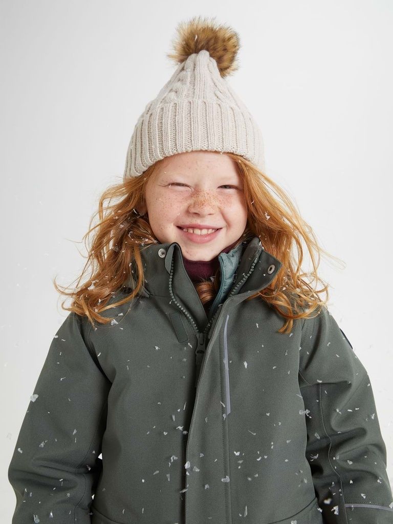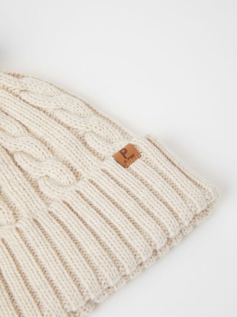Mütze mit Zopfmuster aus wärmendem Wollmix mit bezauberndem Pompon. Die Mütze hat einen praktischen Umschlag, der die Ohren warm hält.