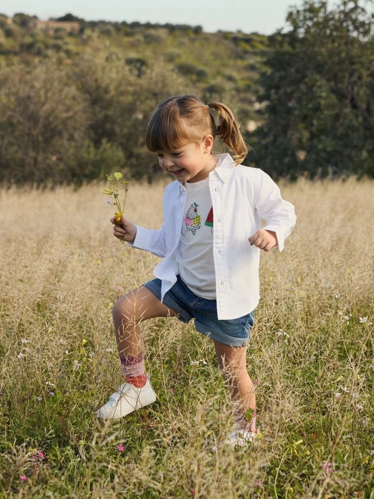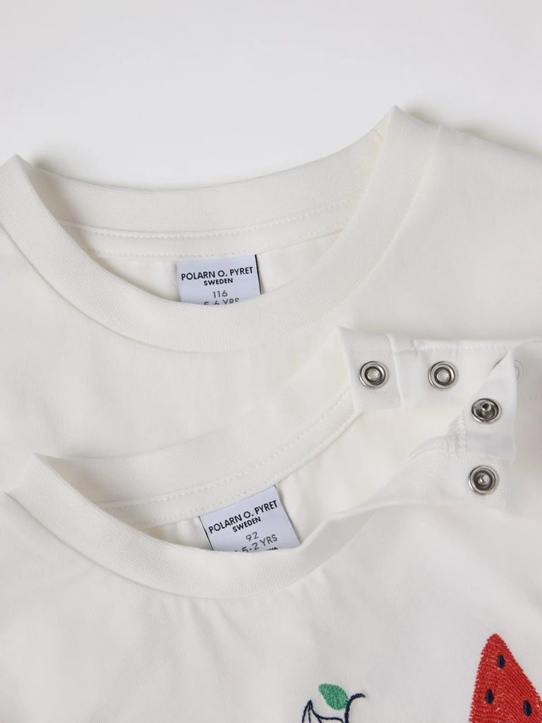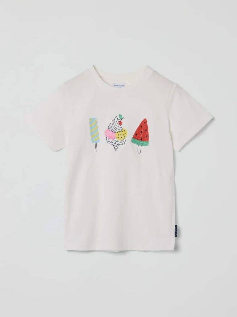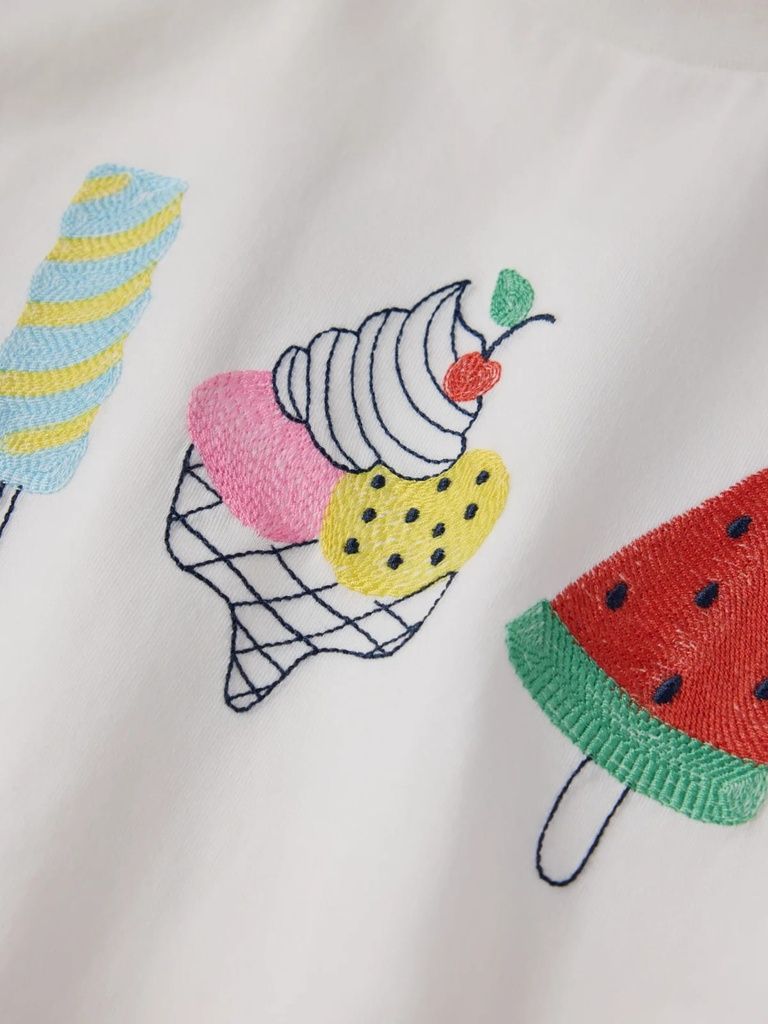 Dieses T-Shirt aus weicher Bio-Baumwolle bringt mit seiner liebevollen Eis-Stickerei sommerliche Leichtigkeit in die Garderobe deines Kindes. Ideal für warme Tage – angenehm auf der Haut, stylisch im Look.